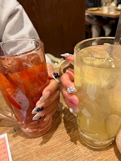 こんばんわ~🌙 はるか です🎀🎀 きょう🕤います🐰💗 髪色もネイルも変えたから見にきてね🌟 こないだれあちんが居酒屋さん つきあってくれました🥺 実は通ってるネイルサロン一緒なの^ ^ ネイルかわいーね🎀🩷
