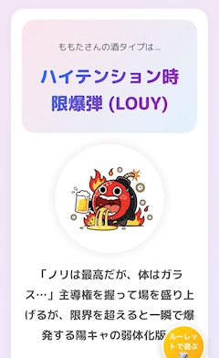 こんばんわ ももさんです お酒タイプ診断 ほんとにこれすぎる、、、 迷惑㌠ってことかな^_^ 時限爆弾卒業できるようにがんばります